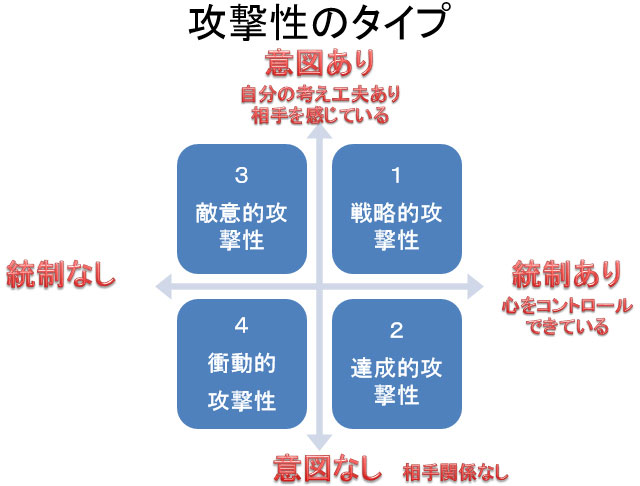 例えば、プレーを心理的な側面で見ると、大きく4つにわけられます。意図があるかないか=縦軸。また統制(コントロール)があるかないか=横軸と設定した場合、一番悪いプレーから順番にお話します。