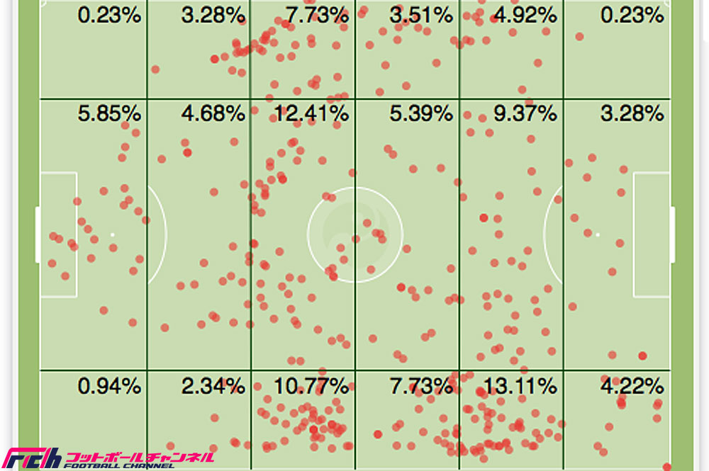プレーエリアを示すヒートマップを見ると、リンガートとヤヌザイが敵陣を濃く染める一方で、ヤングは自陣に押さえ込まれていたことが分かる。さらに、プレーエリアを数値化したアクション・エリアを見ても右サイドが13.11%だったのに対して左サイドは4.92%と大きな差がついている。