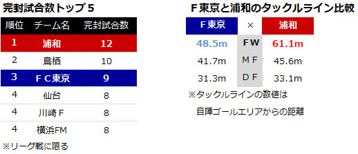 失点数の少なさで2位のF東京と1位の浦和。完封試合数でもF東京が3位で浦和が1位となっており、堅守をベースに着実に勝点を重ねてきた2チームといえる。