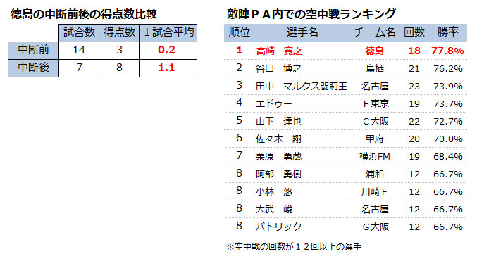 ワールドカップによる中断前後の得点数を比較すると、徳島は中断前が1試合平均0.2点だったのに対し、中断後は1.1点と大幅にアップ。その要因の1つとして高崎の好調ぶりがうかがえる。徳島のエースは中断前には1得点にとどまっていたが、中断明け以降は6得点を挙げ、残留へ向けて大車輪の活躍を披露。