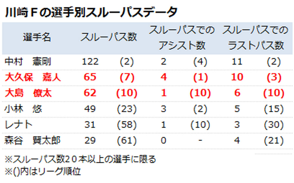 川崎Fはスルーパスからの得点数が10で、これは得点全体の23%を占める数字。選手ごとのスルーパスのデータを見ると、大黒柱の中村を筆頭に大久保、大島、小林もリーグ上位の成績を残している。
