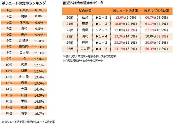 一方の清水は、6試合連続で複数失点を記録。被シュート決定率がリーグワーストであることからも、守備に問題を抱えていることは明らかだ。22節から3バックを導入したものの、組織的な守備を確立できたとはいえず、前節のG大阪戦では最終局面における寄せの甘さが目立った。