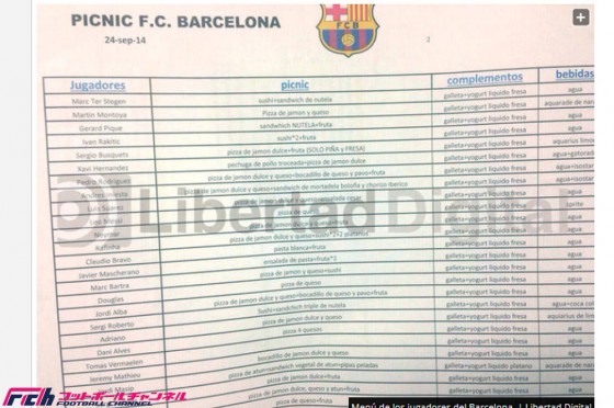 リーガエスパニョーラのバルセロナが24日に敵地で行われたマラガ戦で無得点試合に終わった直後、控室で注文した軽食リストがスペイン紙リベルタード・デジタルに流出した。25日の英大衆紙メールなどの複数メディアが報じた。
