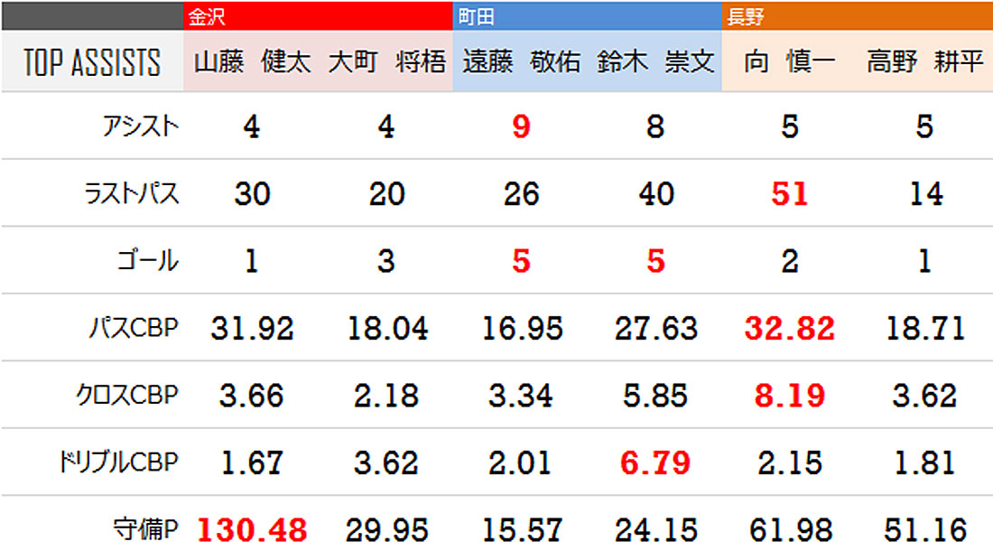 長野は左サイドの高野耕平と中盤の向慎一がともに5アシストでチーム内1位。パスCBP、クロスCBPが6名中トップの向はセットプレーのキッカーも担っている。ちなみに、彼らが5アシストを記録したのは6月までの試合で、7月以降だけで見るとロングスローを持つ松原優吉や、得点王で紹介した宇野沢が記録した2アシストがチーム内トップとなっている。