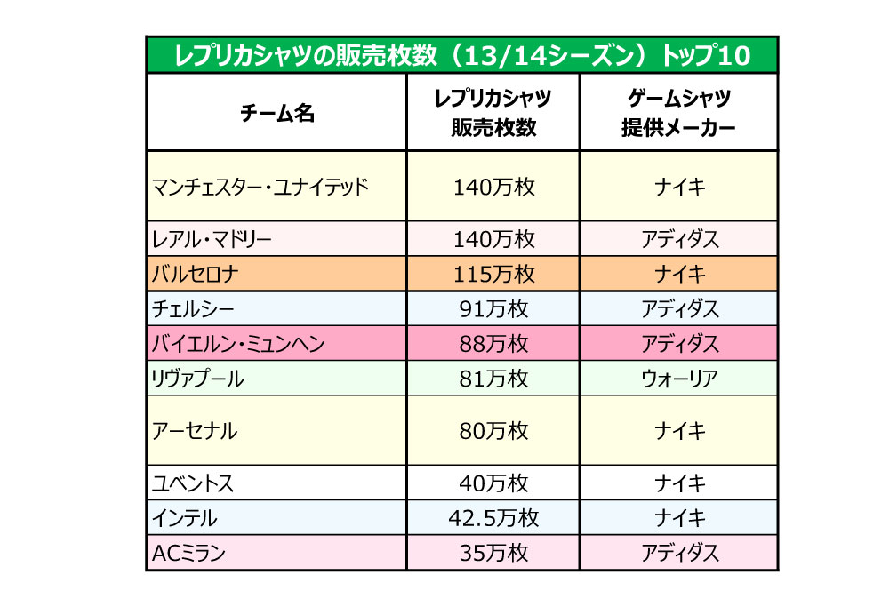 次表は、クラブ別レプリカシャツの販売枚数を示した表だが、例えばユナイテッドのグッズ販売額は、本国よりも中国のほうが大きいように、ここでも顔を覗かせるのは、いつもの常連チームだ。