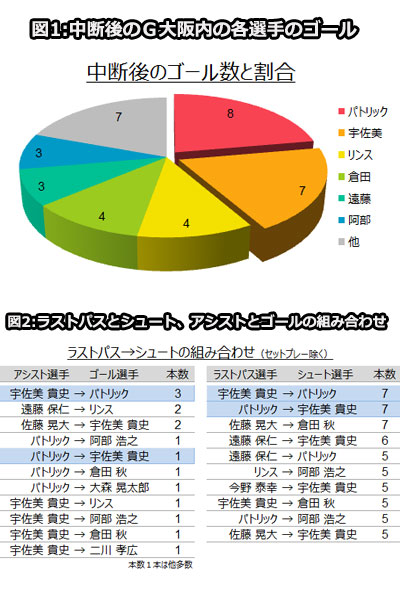 この数字が何を意味するか分かるだろうか。これは図1に示した15節以降の試合におけるパトリックと宇佐美による得点数の総数に対する割合だ。全ゴールの半分近くを2人が奪っているというデータだけでも、オフェンス面における彼らの貢献度がどれだけ高いか分かるだろう。とりわけ、前者は7月に途中加入をすると即座にチームのスタイルにフィットし、宇佐美と見事な関係を構築(図2)。鹿島戦では宇佐美のアシストでパトリックが得点を奪うなど、ホットラインとして攻撃を牽引している。