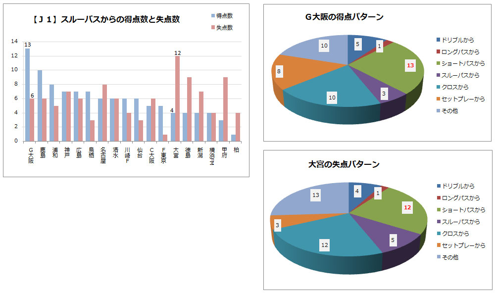 G大阪はショートパスからの得点数がJ1トップ、大宮はショートパスからの失点数がJ1ワースト1位と、攻守において対称関係にある両チーム。それぞれの割合で見ても、その項目がチーム内で最も多いパターンとなっている。リーグ戦では片やACL圏内、片や残留争いの渦中。ホームのG大阪がデータ通りに大宮をねじ伏せるのか。