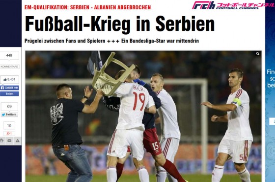 14日、EURO2016予選第3節が行われ、グループIのセルビア対アルバニア戦が途中で中止になるという事件が起こった。ドイツ紙『ビルド』は、この試合は何度も中断される事態が起きていたと伝えている。