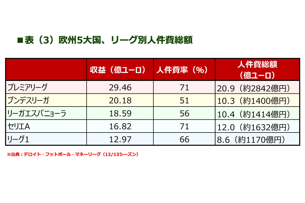 これを見ると分かるように、もっとも健全経営がなされているのがブンデスリーガで、プレミアリーグやセリエAの人件費率は70%を超え、リーグアンも70%に迫る勢いだ。