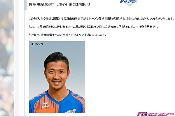 V・ファーレン長崎は5日、佐藤由紀彦の今シーズン限りでの現役引退を発表した。