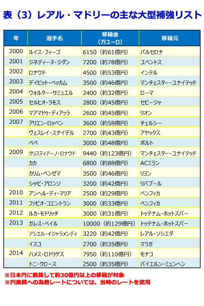 表(3)は、『銀河系軍団』と呼ばれるレアルが、ボスマン判決以後、今季までに行った大型補強リストである。