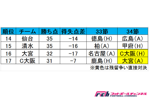 これによりJ2降格は仙台、清水、大宮、C大阪のうち2チームということになる。残り2試合でどのようなドラマが待っているのだろうか。各チームの次節における残留および降格の条件を確認する。