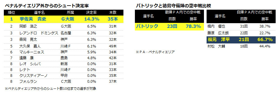 両チームには大きな戦力差があるため、徳島は守備を固めてくることが予想される。それでも、G大阪はこのディフェンスを破るだけの攻撃力を持つ。その攻撃の中心となっているのが宇佐美とパトリック。ペナルティエリア外からのシュート決定率を見ると、宇佐美が他を圧倒している。守備網を崩さずとも、ゴールを奪えることは強みだ。