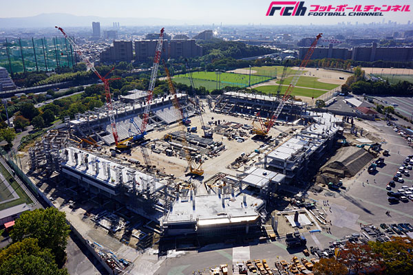 本誌でガンバ大阪の特集を組み、クラブハウスを訪れるのはおよそ1年ぶり。今回、最寄りの万博記念公園駅を降りてから歩いてクラブハウスを目指すと、まず巨大なショッピングモールらしき鉄骨郡が目に飛び込んできた。その先に、まだコンクリート打ちの新スタジアムの骨組みが姿を現したのである。しばしその場で歩を止めて見入ってしまった。