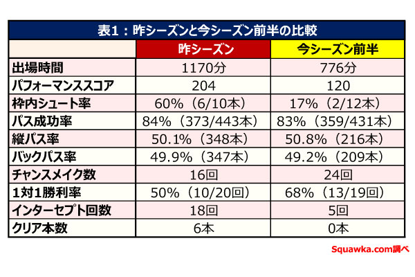 まずは、攻撃・守備・ポゼッションの評価を数値化した「パフォーマンススコア」。不振と言われた昨季は204で、今季前半は120。もちろん出場試合数が違うため合計数で比較することはできないので、1試合平均を出すと昨季は11.3で今季前半は10。わずかに今季前半が下回ったものの、ほぼ横ばいの結果となった。