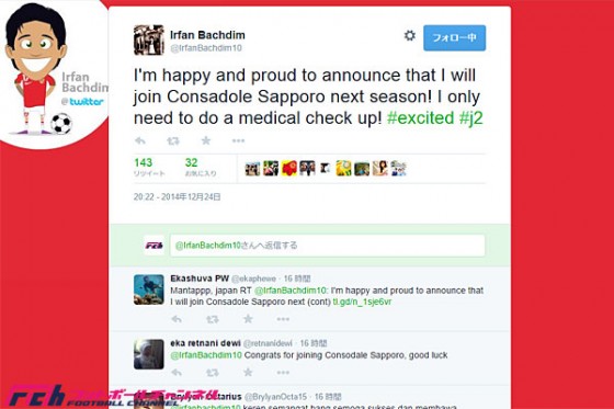 今月22日、ヴァンフォーレ甲府からJ2のコンサドーレ札幌への完全移籍が発表されたインドネシア代表のイルファン・バフディムが、自身のツイッター(@IrfanBachdim10)で移籍の心境を明らかにした。