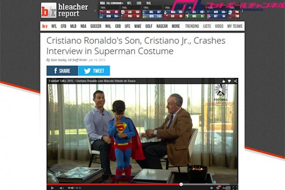 ロナウドの息子、クリスティアーノ・ロナウド・ジュニア君は、父親がインタビューを受けている最中、突如スーパーマンのコスプレで登場した。