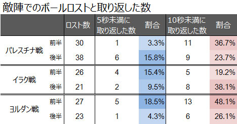 表は敵陣でボールを失った後に早くボールを奪い返せたかどうかを表した数値だ。各試合の前半と後半で、それぞれ5秒未満、10秒未満に取り返した数とその割合をまとめた。