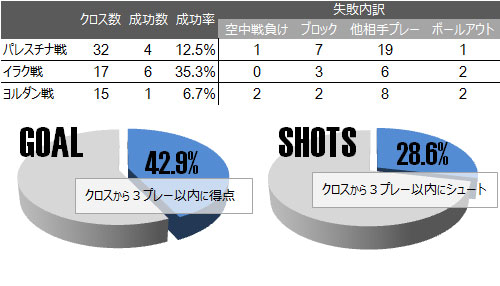 ヨルダン戦はゴールにつながった1本のみの成功に終わっており、成功率としてはパレスチナ戦の約半分となってしまったが、クロス「失敗」の内訳を見ると、初戦で多かったニアでブロックされた数が大幅に減っており、クロス失敗の質が初戦とは異なることが分かる。