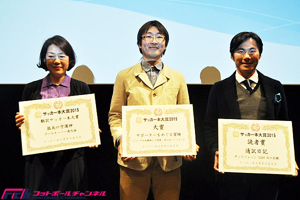「東京国際フットボール映画祭」の熱気も冷めやらない秋葉原UDXシアターにて行われた「サッカー本大賞2015」の授賞式では、初めに選考委員長を務める佐山一郎氏より、今回ノミネートされた12作品の優秀作品に賞状が授与された。その後、本年度の「サッカー本大賞」「翻訳サッカー本大賞」「読者賞」の発表へ。