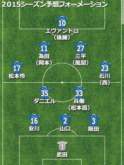 末吉隼也、林容平といった選手が期限付き移籍期間満了となり、高木和道(→岐阜)や伊藤大介(岡山)のような主力もチームを離れた。中心選手を手放したことはピンチでもあるが、同時にさらに大きなチームへと変容するためのチャンスでもある。ディフェンスリーダーとして期待される山口貴弘、中盤のクオリティーを上げる兵働昭弘の二人がそのカギを握るだろう。前線には外国籍選手に加えて岡本英也、三平和司という実績十分のアタッカーも獲得し、成長株の為田大貴もいる。チームのストロングポイントだ。