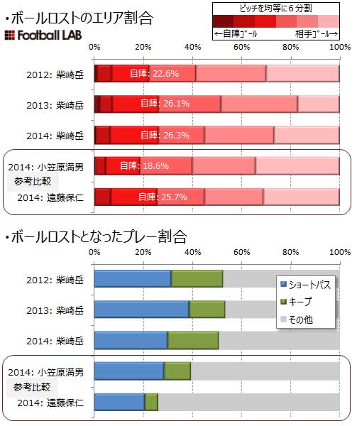 もう1つのグラフはロストとなったプレーの割合。ロングパスやクロスの失敗に比べ、ショートパスやキープからボールを奪われた場合、相手がすぐボールコントロールできる状況となり、かつ味方の守備への切り替えも一瞬遅れるため、カウンターを食らいやすい。柴崎はそういったショートパス・キープからのロスト割合が小笠原、遠藤よりもはるかに多く、「危険な失い方」をしているのは明らかだ。