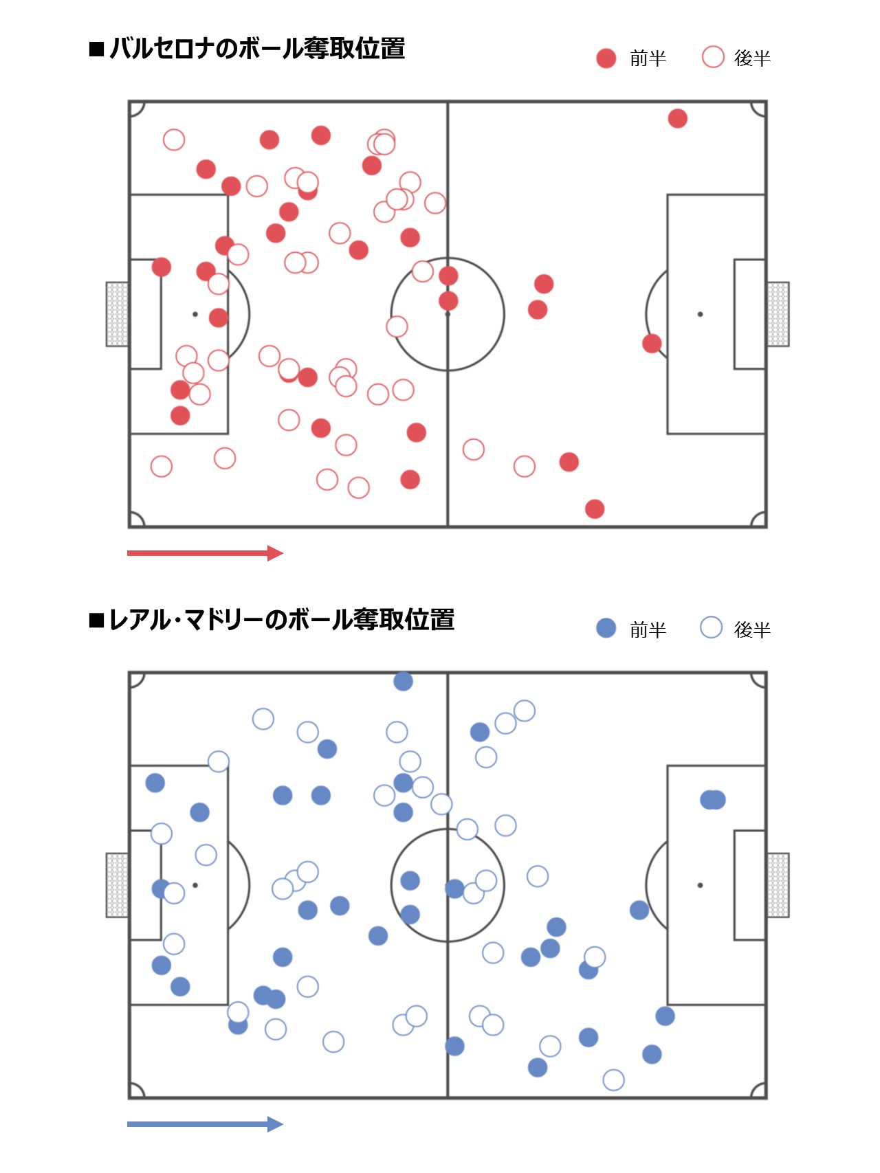 ラ・リーガ 11年前 【データで振り返るクラシコ】C・ロナウド頼みのレアルと徹底マークで応戦のバルサ。後半の策で勝敗に明暗 text by 編集部 ボール奪取の位置 両チームのボール奪取の位置(データ:『Wyscout』より) バルサは後半、マドリー陣内で2度しかボールを奪えていない。しかしマドリーは試合を通じてピッチ全体でボールを奪っており、後半はバルサ陣内で14回ボールを奪っている。ボール奪取位置を見ると、マドリーが高い位置からプレスをかけていたことがわかる。 【次ページ】両チームの攻撃の違い クラシコ クリスティアーノ・ロナウド スペイン バルセロナ リーガエスパニョーラ レアル・マドリー 1 2 3 4