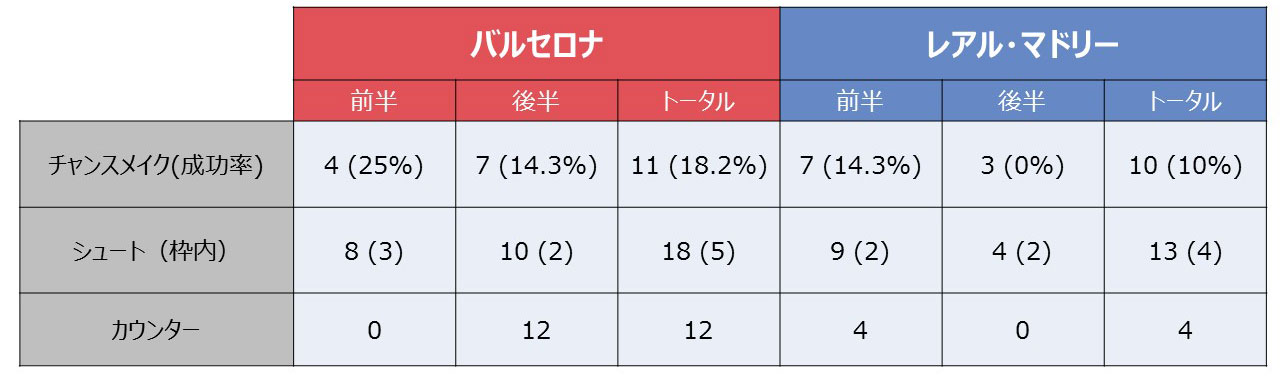 マドリーからの激しいプレスを受けたバルサはカウンターで応戦した。前半は1本もなかったカウンターが、後半には12本と急増している。