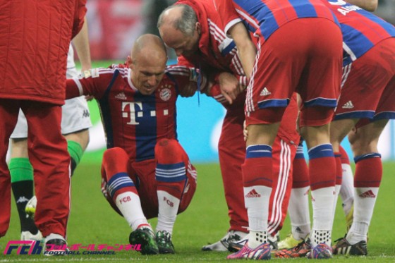 ロッベンはチャンピオンズリーグ(CL)2ndレグ、ホームのシャフタール・ドネツク戦で負傷し、第25節のブレーメン戦を欠場。26節のボルシア・メンヒェングラードバッハ戦で先発復帰したものの、開始わずか24分で再び負傷交代を強いられていた。