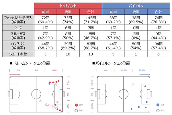まず、攻撃面のデータを見ると、ファイナルサードへ侵入した回数(図2-1)はドルトムントが145回でバイエルンが約半数の76回。図2-2のクロスを入れたエリアをみてもドルトムントがファイナルサードで20本を記録しているのに対して、バイエルンはわずか5本。