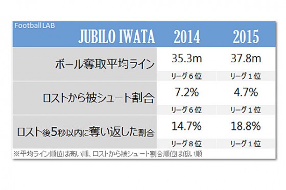 昇格候補の1つである磐田は7節終了時点で16ポイントを奪い、現在2位。ジェイ、アダイウトン、カミンスキーといったポテンシャルの高い助っ人を獲得し、そんな彼らの活躍も目を見張るものがあるが、好調を支えている1つの要因として、攻守の切り替え時の変化が挙げられる。昇格を争った昨季も高い数字を記録していたが、今季に入ってその値はさらに顕著なものとなった。