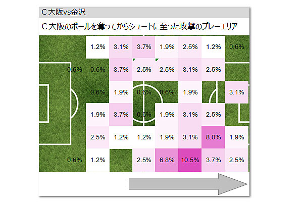 ボールを失ってから被シュートへ至った割合は8.2%。実はこのコラムの準備を始めた段階(6節終了時点)では、5.9%と昨季よりも良い数値だった。しかし、C大阪戦でのロストからの被シュート割合で20.2%を記録し、現在の数値に。この試合におけるC大阪のボールを奪ってからシュートへ至った攻撃のプレーエリアを見ると、右サイド(金沢側から見ると左サイド)を狙っていることが分かる。結果的にゴールにたどり着くことはなかったが、このデータは今後無視できないものとなるかもしれない。