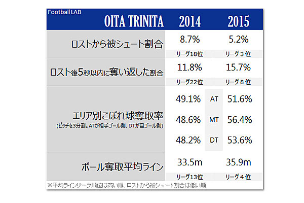 奪われてから被シュートに至った割合は5.2%とリーグ3位の低さで、昨季よりも大きく減少。奪われてから5秒以内に取り返す割合も約4%増加し、こぼれ球奪取率を見ると全エリアで50%を超えている。ボール奪取位置も昨季に比べて高くなった。