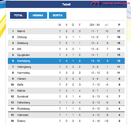順位表を追って見てみると、首位マルメFFが5勝2分、2位IFエルフスボリが5勝1分1敗、3位IFKイエーテボリが5勝1分1敗、4位AIKソルナが4勝2分1敗、5位ジュールガルデンIFが4勝1分2敗、6位IFKノルシェーピンが4勝1分2敗、7位ヘルシンボリIFが3勝2分2敗、8位ハマルビーが3勝2分2敗。