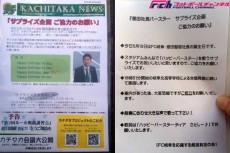さらに用件のみを記したシンプルなビラを作り、入場者一人ひとりに手渡しをした(写真右)。また、アウェイの愛媛サポーターにも連絡を取り、協力を依頼した(この依頼は内容がうまく伝わらなかったようだが、愛媛サポーターなら事前の連絡がなかったとしてもおそらく同じ結果になっていただろう)。
