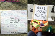 その人たち一人ひとりに声をかけて回っている男性がいた。手に何かを持ち、それを座っている観客に差し出している。色紙だった(写真左)。男性の名前は和泉逸平(いずみいっぺい)。「愛媛サポートクラブ」(http://ehime-support.net/)のメンバーだ。