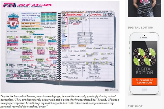 イギリス『BBC』のコメンテーターを務めるニック・バーンズ氏は非常に美しいイラストとともに試合結果をまとめている。ノートには対戦チームのエンブレムやユニフォーム、フォーメーション、メンバー、スコアなどが書かれている。