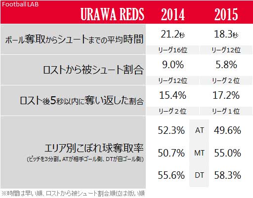 また、ミドルサード、ディフェンシブサードでのこぼれ球奪取率が増加しており、相手の二次攻撃を防ぐとともに自チームの攻撃回数を高めている。よりレベルアップした浦和が今年こそタイトルを獲るのか注目だ。