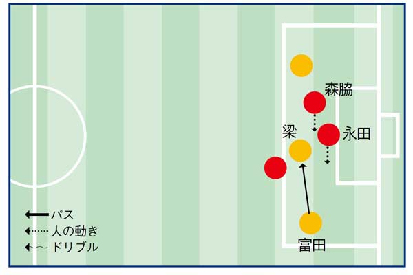 「ペナルティエリア内の狭いスペースでパスを受けた瞬間に相手DFの動きと、GKの位置を確認し、冷静にゴールを決めていることがわかる」