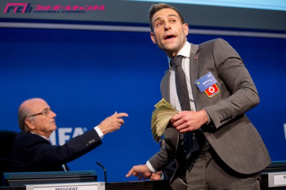 汚職問題に揺れたブラッター会長にして、「ブラッター、これは北朝鮮が2026年W杯を開催するための賄賂だ。よろしく頼むよ!」と叫び、そのまま警備員に取り押さえれて、退席となった。
