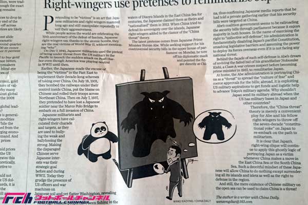 アトキンス氏は読みかけの現地新聞を見せてくれた。そこにはかわいらしいパンダをモンスターとして描いている安倍晋三首相と思わしき人物が描かれている。先に発表された「防衛白書」で日本政府は中国への警戒と批判を強めたが、それを中国側は良く思っていない。中国共産党の意図を現地メディアは寸分違わぬよう伝えている(中国では報道に共産党中央宣伝部による検閲が入る)。