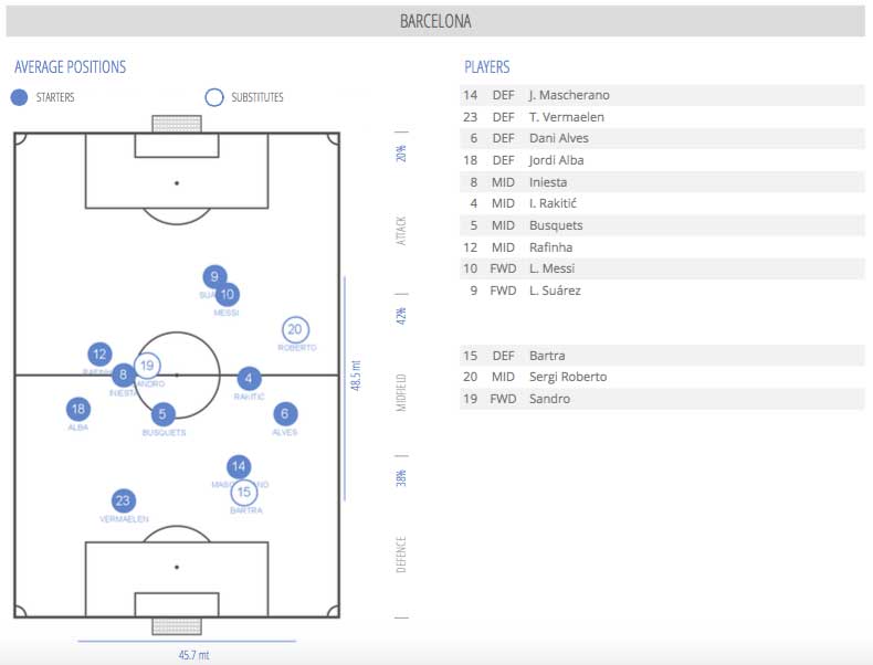 まず、『Wyscout』が出すビルバオとの開幕戦の平均ポジション(図1)を見ると、CBを組むヴェルメーレンとマスチェラーノと、アンカーを務めるブスケツは三角形を作るようにポジションを取っている。