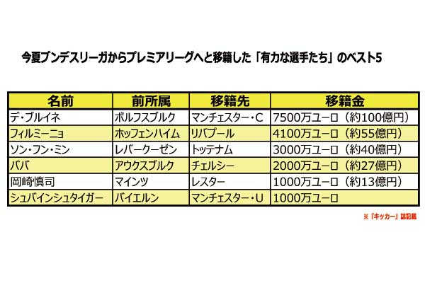 『キッカー』誌記載の、今夏ブンデスリーガからプレミアリーグへと移籍した「有力な選手たち」のベスト5は図のとおり。順位は移籍金の額を基準とする。