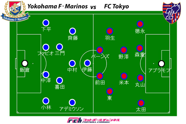 Jリーグ 10年前 【今節のPICK UP GAME 】横浜FM対FC東京。共通の武器を備えるチーム同士の対決を制するのはどちらか text by 編集部 photo by Getty Images 両チームの予想スタメン 両チームの予想スタメンはこちら! 横浜FMのアデミウソンは、攻撃面ではチームの軸の1人として存在感を示しているが、守備での貢献は改善の余地がある。本人も右SBの「パンゾー(小林祐三)をディフェンスで助けたい」と意気込んでおり、ブラジル人アタッカーの守備に注目だ。 FC東京は高橋秀人の代わりに野澤英之が入りそうだ。持ち前のパスセンスで攻撃を操りたい。 【了】 FC東京 focus J1 Jリーグ 日本 横浜F・マリノス 1 2