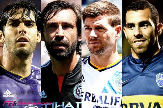 現在アメリカ大陸には、メジャーリーグサッカーのオーランド・シティで活躍するカカ(写真:左)、ニューヨーク・シティに加入したアンドレア・ピルロ(写真:中央左)、ロサンゼルス・ギャラクシーに加入したスティーブン・ジェラード(写真:中央右)、アルゼンチンのボカ・ジュニオルスに復帰したカルロス・テベス(写真:右)らスター選手が多く在籍している。