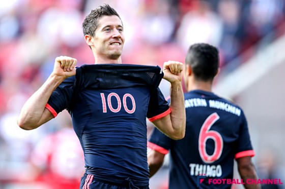 マインツ戦で2得点を決めたレバンドフスキは、ブンデスリーガの外国人選手としては最速となる168試合で100ゴールを達成。得点後にはユニフォームの下に着ていた「100」とかかれたTシャツを見せるパフォーマンスを披露した。果たして、今季はどこまでゴール記録を伸ばすのだろうか。