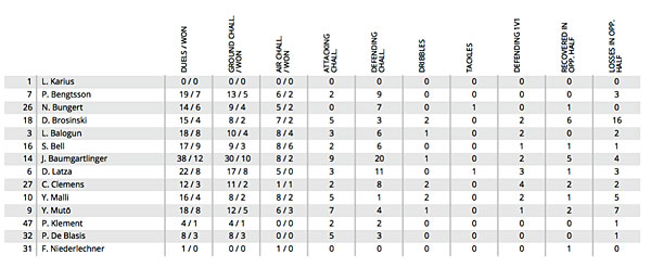 例えば、現在ブンデスリーガ得点ランクで首位に位置するドルトムントのピエール・エメリク・オーバメヤンは1試合につき「デュエル」の数は10~20回程度の数字にとどまっている。