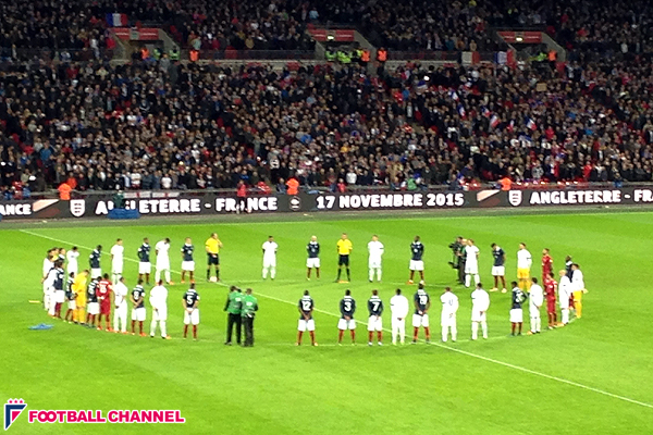 その後、両軍の選手たちがセンターサークルに沿って輪になり、1分間の黙祷。各国の試合会場でも黙祷が行なわれたが、当事国のフランスを迎えたウェンブリーのそれは、ことさら重みがあった。
