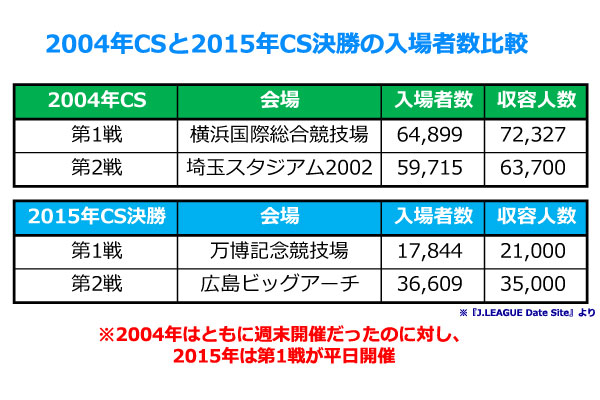 上位3チームが年間王者を争い、決勝戦は広島対G大阪となった。前回のCSは2004年で、当時のカードは横浜FM対浦和だった。本拠地の収容人数も異なるため、単純な比較はできないが、2004年と今季のCS決勝における観客動員とあわせ、4試合の入場者数を表3で示した。