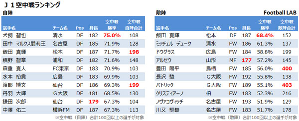 飯田真輝は自陣で3位、敵陣では1位に輝き、両方でランクインを果たした唯一の選手となった。自陣の上位には槙野智章や森重真人など、日本代表に招集されているセンターバックが何人も名を連ねている。